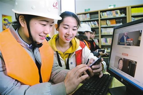3月9日,江苏镇江金山水城社区,江苏科技大学志愿者正在为外来务工人员讲解政府工作报告中有关农民工权益保障的内容。喻永光摄(中经视觉)