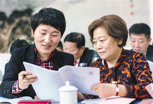 3月10日,人大河南代表团举行全体会议。全国人大代表、中铁装备集团有限公司总工程师王杜鹃(左)和全国人大代表、河南省洛阳市文联副主席王绣在交流中认为,解决农民工欠薪问题,必须依靠法律的支持。记者 李景录 摄