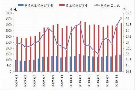 从日本钢铁联盟的数据来看,2009年到2010年,受灾区域钢材的订货量基本占到日本钢材订货总量的30%左右,因此短期内日本部分钢材品种的出口将会受到影响。而受灾地区钢铁产量的减少必然导致市场资源供应紧张,从而推高相关产品的价格。