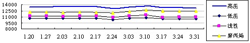 A、聚乙烯(PE):本周国内大部分地区市场缺乏买气力撑,进一步趋淡,商谈就爱个有50-100元的松动空间,市场市场成交疲滞,其中高压、线性聚乙烯出货压力偏大。