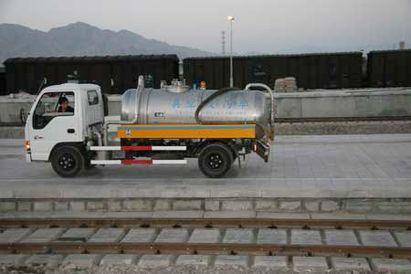 资料图片:格尔木火车站的真空垃圾车。(图片来源:中国西藏信息中心)