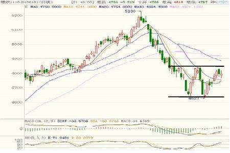 从K 线图来看,Rb1110 合约自4900 元一线大幅跌至4627 元,期间反弹至4850 元附近,但未能走出一波涨势。目前短期均线拐头向上,但仍在中长期均线之下。MACD仍在零轴之下,但存在逐步上涨可能,KDJ 高位交叉,短期或震荡回调。预计期价后市或以震荡整理为主,RB1110 合约波动区间或为4650-4850 元。