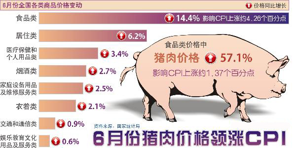 新华网上海7月9日电(记者沈而默、桑彤)国家统计局9日公布的数据显示,6月份全国居民消费价格指数(CPI)同比上涨6.4%,创3年以来的新高。 猪肉价格暴涨成为物价上涨的主要推手。在成本上升、输入型通胀压力不减的情况下,很多商品、服务也都搭上了涨价快车。然而随着导致通胀的根本因素——货币调控效果的显现,CPI涨幅已是强弩之末,在今年下半年将缓慢回落。